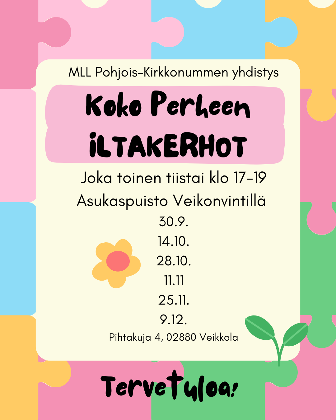 Olemme koonneet teille Veikkolan alueen perhekalenterin keväälle 2025. Kalenterista näkyy mitä toimintaa Veikkolassa on pikkulapsiperheille. Tervetuloa mukaan ja tapaamaan toisia lapsiperheitä.
