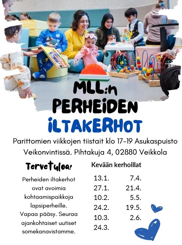 Kerhot kokoontuvat Veikkolan asukaspuisto Veikonvintissä (Pihtakuja 4) parittomien viikkojen tiistaisin klo 17.00 - 19.00. Kerhossa on vapaata ohjelmaa kuten askartelua ja aktiviteetteja liikuntasalissa. Kerhon aikana lapset ja huoltajat voivat tutustua alueen muihin perheisiin ja saada kivaa tekemistä alkuviikkoon. Vapaa pääsy. Tarjolla on maksullinen iltapala (maksu 2€/perhe).